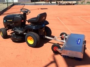 Makkelijk transport De Court Master is makkelijk verrijdbaar, in tegenstelling tot de driehoeksborstel. 'Borstelen op de tennisbanen gebeurt meestal door oudere vrijwilligers. Het is een pittige taak om de driehoeksborstel rechtop te zetten en, losgekoppeld van de trekker, met de hand door het poortje naar de volgende baan of naar de schuur te manoeuvreren. De Court Master zet je makkelijk omhoog met een borgpennetje en gekoppeld aan het trekkertje kun je hem overal naartoe verrijden.'