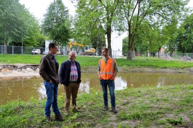 Johan Wessel (gemeente Assen), Bart Veldman en Jan-Bouke Sijtsma (beiden Boom-KCB) staan op het GGZ-terrein in Assen. Door het herstellen van onder andere de oude beeklopen wil de gemeente een aantrekkelijke omgeving creëren voor haar inwoners en toeristen. De loop van de Nijlandsloop op het terrein van GGZ Drenthe was als een van de laatste aan de beurt.
