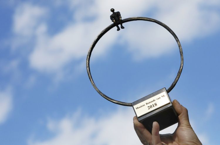 Ard Esselink (r) neemt de trofee van de Mooiste Rotonde 2018 aan uit handen van Hein van Iersel