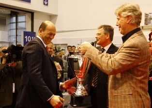 | | Jan Habets overhandigt de beker aan Hans van Rijsewijk. |